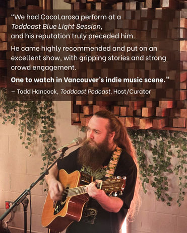 Hailing from Surrey BC, CocoLarosa is a folk singer/songwriter specializing in rhythmically bombastic and lyrically driven storytelling. His music is enjoyed by fans of Bob Dylan, Tom Waits, and John Moreland.​